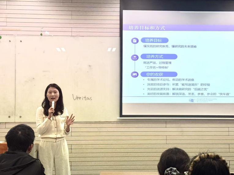 最后,嵇月婷老师详细介绍了2025年“学术新秀班”的培养方案。她指出,学术新秀班以“工作坊+导师制”为主线,构建贯穿全年的模块化培养体系,内容涵盖各专业研究前沿讲座、经典文献深度研读、论文写作全流程工作坊、学术新秀论坛等多元环节。她表示,“学术新秀班”不仅关注学术能力培养,更注重推动学员积累论文发表等实际成果,助力学员在保研、国外深造及各类学术竞赛中脱颖而出。