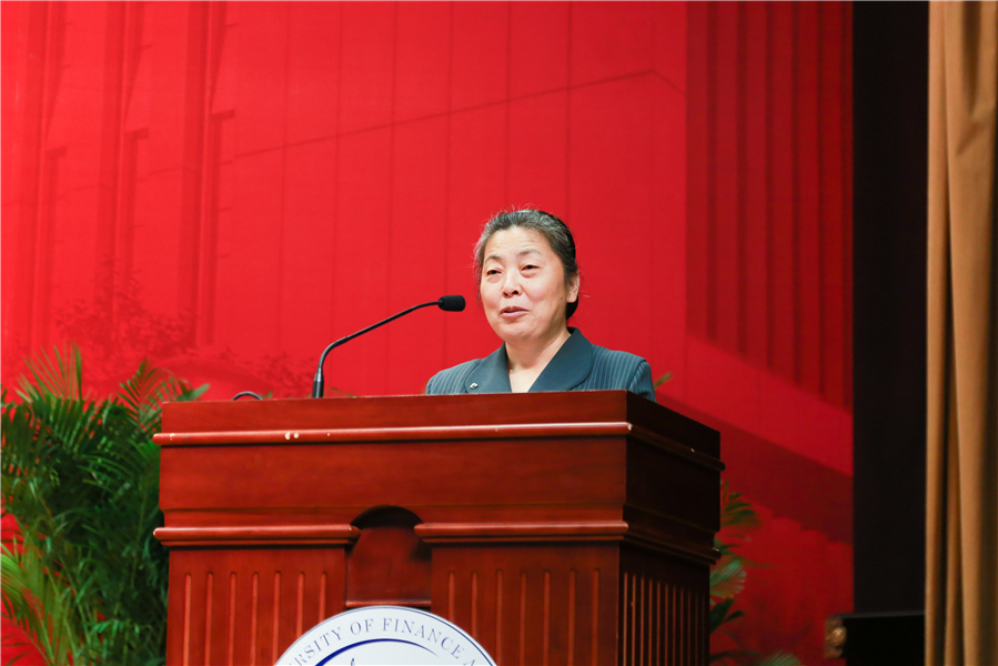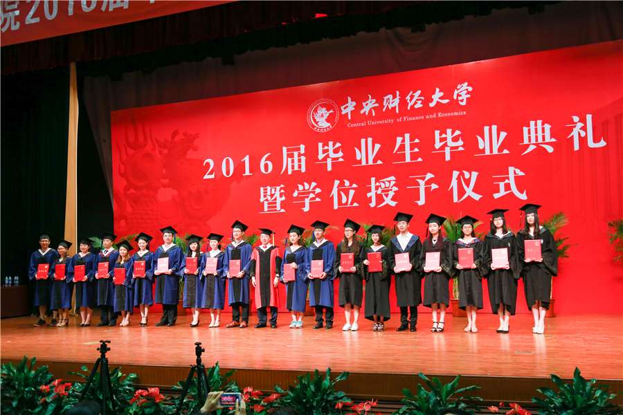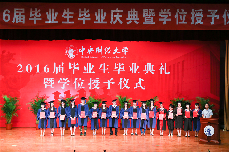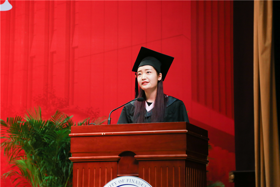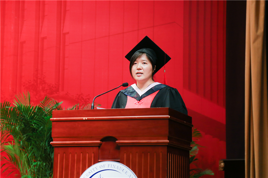 2012级本科生曾戬媛、2014级学术性硕士生蕾拉、2014级MBA硕士生殷丽莉、2013级博士生韩慧林分别作为毕业生代表发表了毕业感言。代表们回顾了难忘的校园生活,衷心感谢老师们付出的心血和汗水,感谢同学们彼此之间的关爱和帮助,感谢亲友们在自己求学之路上的支持!他们表示,作为中财的毕业生,他们一定自觉担负起时代赋予的历史重任和光荣使命,秉承母校“忠诚、团结、求实、创新”的校训,牢记老师们的谆谆教诲,在今后的工作中谱写新的篇章,创造新的辉煌,以骄人的成绩为母校增光添彩,为实现中华民族伟大复兴的中国梦努力奋斗!来自物流管理专业的曾戬媛同学已被美国俄亥俄州州立大学哥伦布分校录取,她的2012级本科同学中还有30位小伙伴也将分赴海外,前往伦敦政治经济学院、纽约大学、新加坡南洋理工大学等国际知名高校深造;而学术型硕士研究生代表蕾拉则是来自非洲马里共和国的留学生,她用流利的中文表达了她对beat365在线登录官网、中财beat365在线登录官网师生友人们的感谢,要将这份真挚的情谊带回她的祖国!
