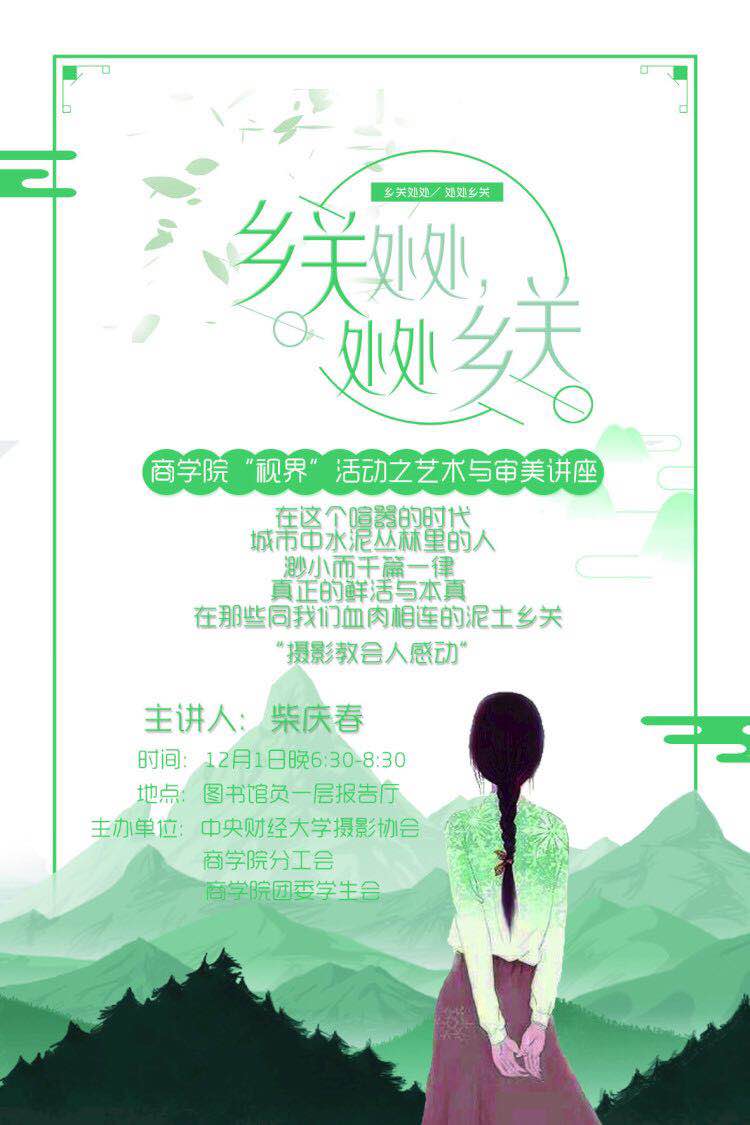 此外,为进一步让在校师生了解摄影艺术的魅力,12月1日在沙河校区图书馆负一层报告厅,柴庆春老师还举行了一次“乡关处处,处处乡关”摄影艺术讲座,与师生们分享柴老师的摄影艺术创作经历、心路历程、艺术感悟,获得了师生热泪反响和好评。
