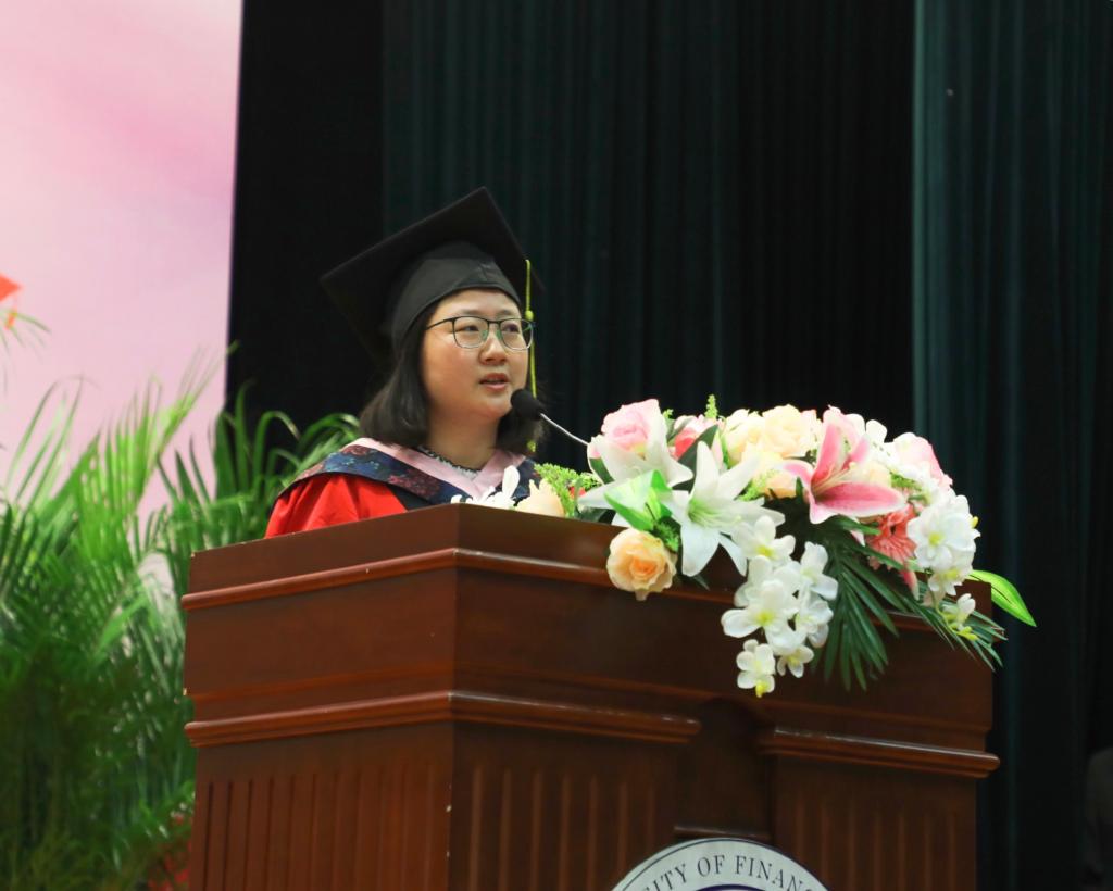 随后,2019届本科毕业生代表赵泽宇、学术型硕士毕业生代表陈金然、博士毕业生代表梁渊、MBA毕业生代表王宇超饱含深情的回顾了校园时光,并代表毕业生祝福母校与学院积历史厚蕴,再谱华章,祝福各位老师身体健康、工作顺利,祝福毕业生展翅高飞、前程似锦!