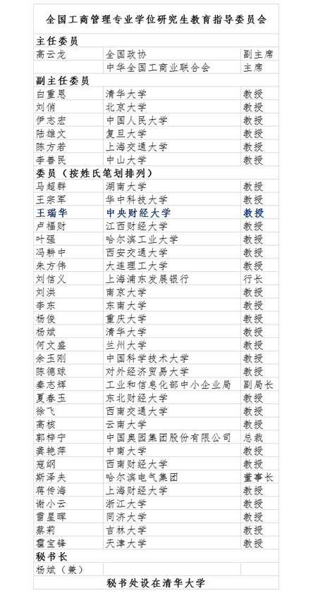 近日,国务院学位委员会发布《国务院学位委员会 教育部 人力资源社会保障部关于全国社会工作等5个专业学位研究生教育指导委员会换届的通知》(学位﹝2019﹞24号),365官网beat365在线登录官网王瑞华教授获聘为新一届全国工商管理专业学位研究生教育指导委员会委员。
