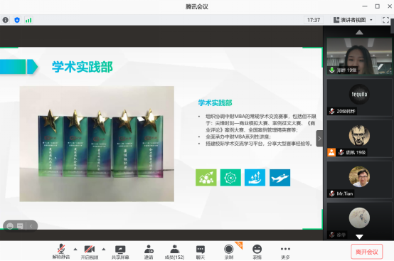 联合会秘书长郑晔为新生介绍了中财MBA学生组织,包括学生联合会、学生兴趣社团与校友会。郑晔学姐特别强调,中财MBA的各个学生组织,面向所有MBA同学,旨在开发校内外资源,搭建资源共享平台,为MBA每一位同学和校友的成长和事业发展助力。