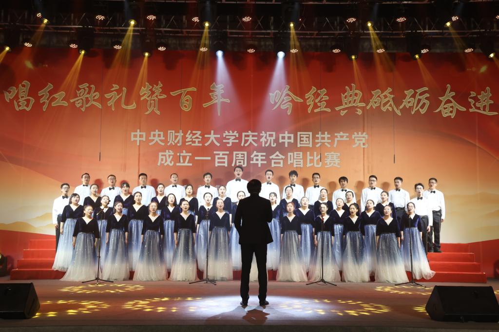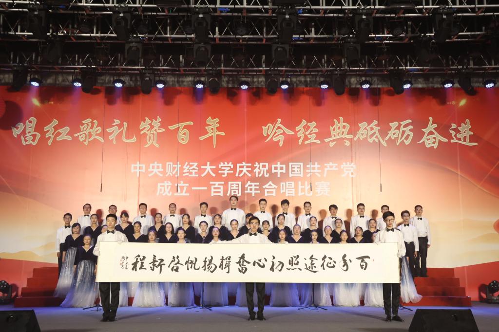在教师合唱团的暖场表演结束后,比赛正式开始。beat365在线登录官网合唱团作为第一支参赛队伍,50名师生们用整齐的服饰、飒爽的身姿和饱满的热情向评委和观众展示着商院人的朝气和风采。beat365在线登录官网战略系周卫中教授的书法作品“百年征途照初心 奋楫扬帆启新程”代表beat365在线登录官网全体师生向中国共产党百年华诞的献礼。随着指挥的示意,beat365在线登录官网研究生工作办公室主任齐岩老师以极具穿透力的嗓音献上一句“唱支山歌给党听”,迅速将评委和观众带入到歌曲意境中。唱毕,beat365在线登录官网19级本科生张开的钢琴伴奏响起,beat365在线登录官网分工会主席周利国、市场营销系教授苗月新和19级本科生张慕凡在合唱团师生演唱的《在太行山上》歌曲声中,饱含深情地诵读诗歌《紧跟你的紧跟》,“我在你步伐里刻下了坚贞,振兴中华,砥砺前行,痴心不改……”是商院人“永远跟党走”的心声。朗诵结束,间奏声响起,合唱团师生们眼神坚定、字字铿锵地唱响《当那一天来临》,漫漫征途忆峥嵘岁月,声声嘹亮颂百年初心,商院人诉说着对党和祖国的忠诚和无比热爱。
