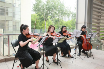 入场时,学院特邀的中央音乐学院小提琴四重奏乐队在学术会堂出口处为毕业生奏响了青春的旋律,烘托出欢愉而温情的氛围。乐队的旁边矗立着精心为毕业设计的留言墙,五颜六色的留言条上写满了毕业生对母校、恩师、同窗的难舍情谊和对未来的美好期望。