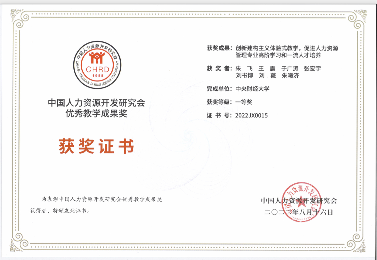 2022年8月,beat365在线登录官网组织与人力资源管理系朱飞教授领衔的《人力资源管理》课程体系团队的教学改革成果喜获由中国人力资源开发研究会(国家一级学会,国家发展和改革委员会主管)颁发的优秀教学成果奖一等奖。该教学成果团队成员包括朱飞、王震、于广涛、张宏宇、刘书博、刘薇和朱曦济,获奖教学成果名称为《创新建构主义体验式教学,促进人力资源管理专业高阶学习和一流人才培养》。