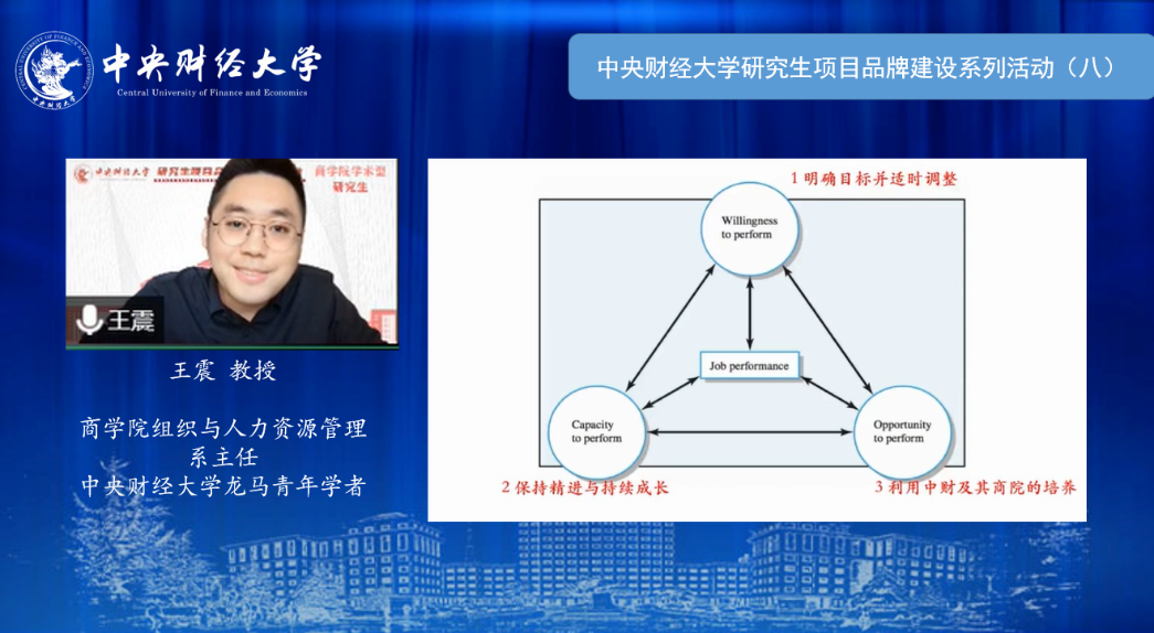 在导师交流环节,王震教授从导师和学生的双重视角与同学们探讨了“如何度过研究生生涯”。王教授利用组织行为和人力资源管理的研究模型,以自己指导的研究生为例,从意愿、能力和机会三个角度向同学们讲述了如何在beat365在线登录官网度过有意义的研究生生活,同时为同学们的学习、科研和生活提供了有益的建议,希望同学们明确目标、付诸实践,提升能力、持续精进,利用资源、获得助力。