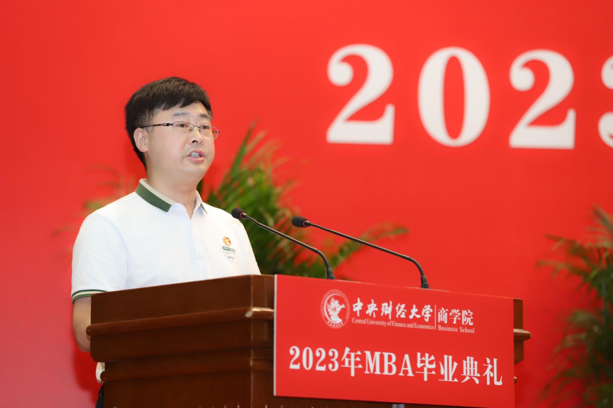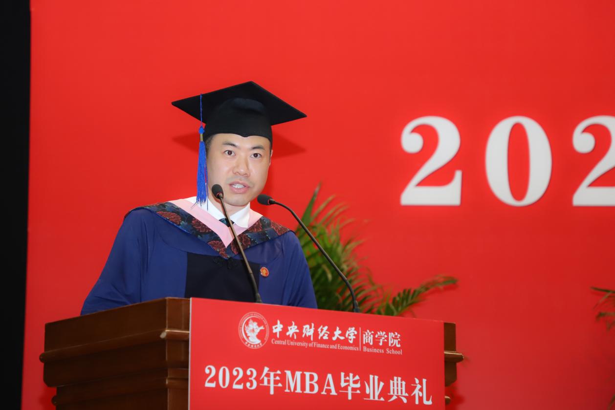 MBA任课教师于晓东作为教师代表发言,并向毕业生们献上真诚的祝福。他表示,非常高兴能代表学院全体MBA授课教师参加同学们的毕业典礼,见证大家毕业的喜悦,祝贺大家满满的收获,展望每个人美好的未来。他谈到,毕业为大家穿梭于工作岗位和学校课堂之间的辛劳和周折画上句号,也为大家开启了更高学位之下新阶段的开始和更高的目标与未来。于老师基于beat365在线登录官网的“商”字 的架构,将对大家的期望与祝福也浓缩在一个“商”字中。“商”的上半部分的“立”,于老师引用《左传》里的“太上有立德,其次有立功,其次有立‘’,期望大家在今后的工作中和生活中,从立德到立功再到立言,都不能放松对自己的要求。“商”字的下半部分“冏”,于老师赋予了炯炯有神和代表光明的内涵,以此祝愿广大毕业生前景光明,祝愿我们的国家拥有光明的未来。