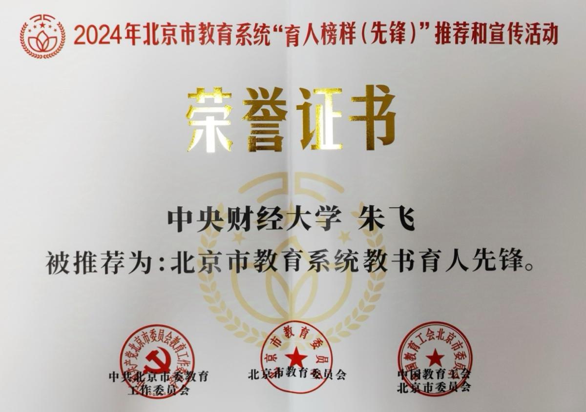 近日,在中共北京市委教育工委、北京市教育委员会、北京市教育工会开展的北京市教育系统“育人榜样(先锋)”推荐评选活动中,beat365在线登录官网朱飞教授荣获2024年度北京市教育系统“育人先锋”称号。
