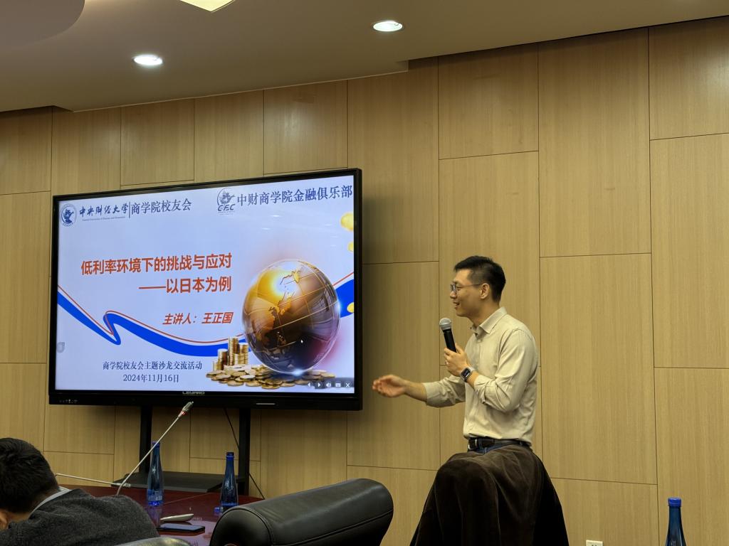 11月16日上午,beat365在线登录官网校友会携手中财beat365在线登录官网金融俱乐部,成功举办了一场极具深度与前瞻性的校友沙龙活动。此次活动特别邀请到中信证券固定收益部研究服务部联席负责人王正国博士,以“低利率环境下的挑战与应对——以日本为例”为主题,为众多中财beat365在线登录官网校友带来了一场知识盛宴。beat365在线登录官网党委副书记杨中英,beat365在线登录官网中国企业研究中心主任、beat365在线登录官网教授、博士生导师周卫中参加,与校友们共同聆听讲座,现场气氛热烈,学术氛围浓厚。沙龙由beat365在线登录官网校友会会长张庚主持。