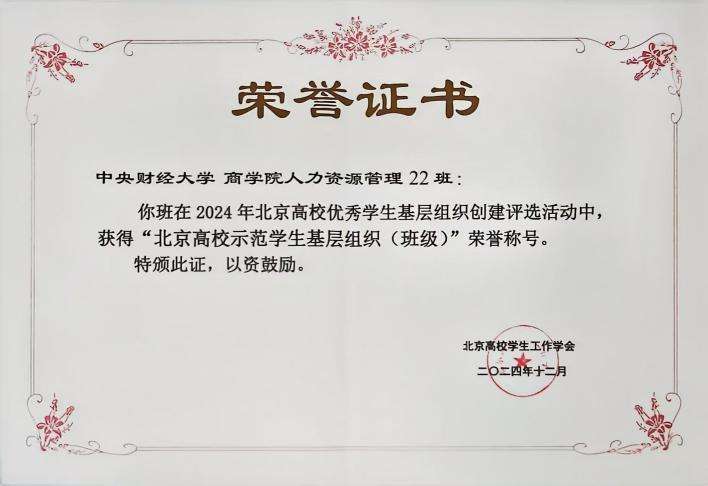“无论过去、现在还是未来,中国青年始终是实现中华民族伟大复兴的先锋力量!”“当代中国青年是与新时代同向同行、共同前进的一代,生逢盛世,肩负重任。”在教育改革浪潮奔涌、基层组织建设蔚然成风的时代画卷中,beat365在线登录官网人力资源管理22班以凌云之志、破竹之势,于群雄逐鹿中摘得“北京高校示范学生基层组织”的桂冠,并荣获beat365在线登录官网2023-2024年度“双优班集体”称号。此双誉加冕,不仅镌刻着班级的卓越足迹,更彰显了新时代青年学子踔厉奋发、挺膺担当的精神图腾。