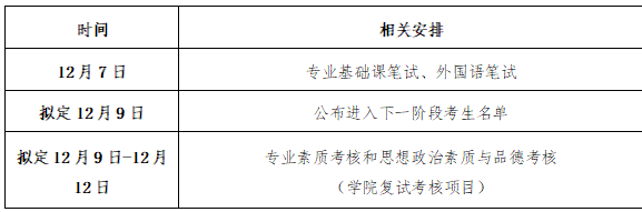 对通过资格评定的考生,由学校和学院组织开展各项考核工作,包括基础素质考核、专业素质考核和思想政治素质与品德考核等环节。基础素质考核环节的考试方式包括专业基础课笔试和外国语笔试,考试时间各为3小时;专业素质考核环节和思想政治素质与品德考核环节的考试方式包括笔试和面试。