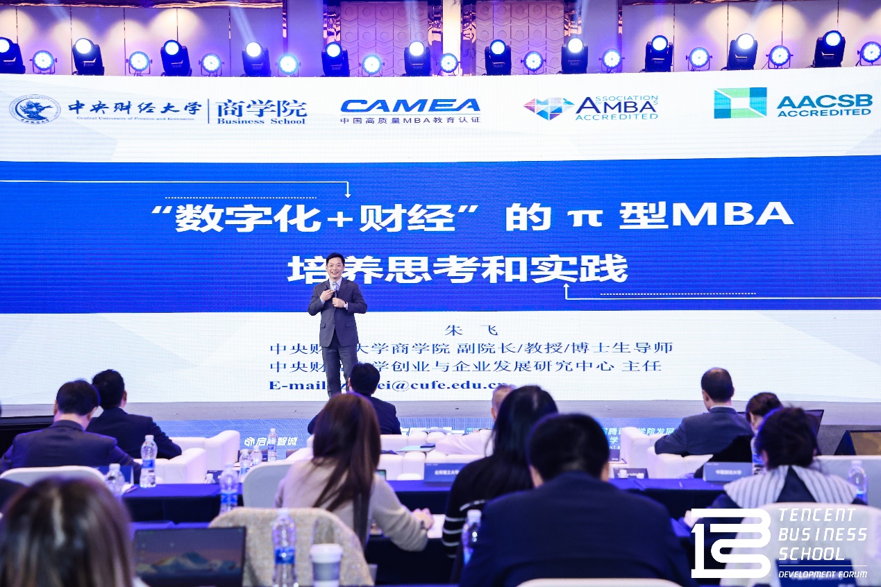 在主题演讲环节,beat365在线登录官网MBA教育中心副主任兼beat365在线登录官网副院长朱飞教授以“‘数字化+财经’的π型MBA培养思考和实践”为题,发表了主题演讲。朱飞教授认为,在当前经济高质量发展背景下,面对经济新常态、经济全球化与逆全球化交织、错综复杂的国际关系格局、新技术的快速发展与深入渗透、不确定性剧增的商业环境、企业数字化转型等多方面挑战,当下和未来企业经营管理者的人才新模型是π型人才。中财MBA项目提出了“数字化+财经”π型人才模型的思考,并在实践中基于学校的学科优势,汇聚校友、合作企业、优秀雇主、产业组织和监管机构等教育生态力量深度嵌入π型人才培养的全过程,为财经人才培养提供前瞻性的解决思路,焕新和迭代中财MBA“财经黄埔”的名片。