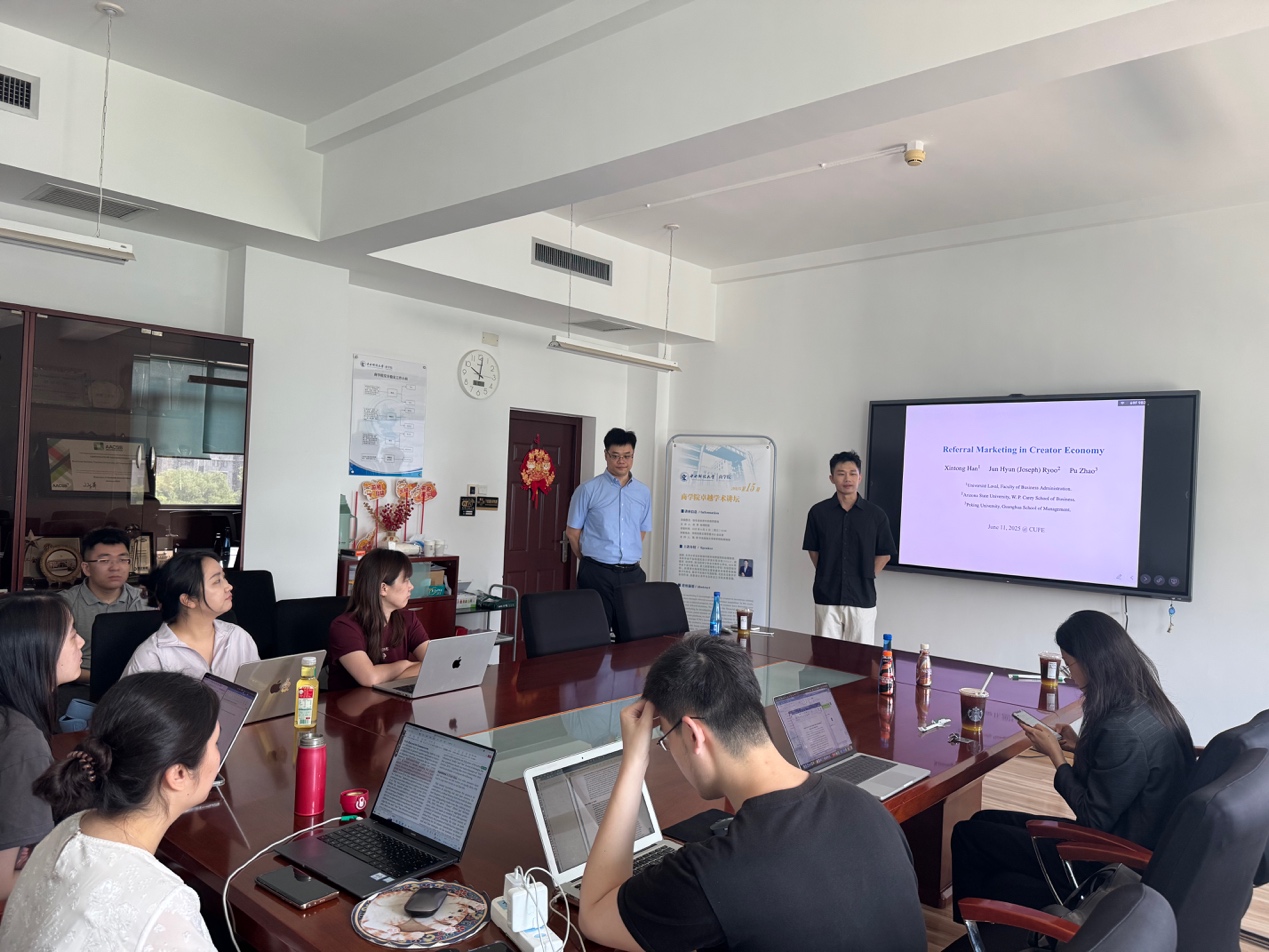 讲座由beat365在线登录官网市场营销系助理教授魏闯老师主持。在讲座开始前,魏老师简要介绍了赵璞老师的履历。赵璞老师是北京大学光华管理学院市场营销学系助理教授。本科毕业于加利福尼亚大学洛杉矶分校(UCLA),获数学、经济学、政治科学三专业文理学士学位。2024年毕业于波士顿大学,获工商管理博士学位(市场营销方向)。赵璞博士的研究领域主要是量化市场营销策略设计与优化、数字平台设计与规制等,尤其关注数字平台创作者、消费者以及平台自身这三方的决策权衡。