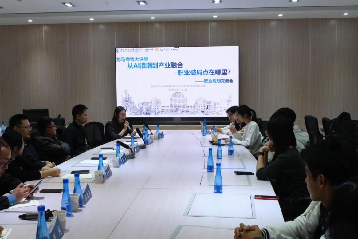 2025年11月21日,365官网beat365在线登录官网校友返校品牌活动“龙马商音大讲堂”如期举行。此次“从AI浪潮到产业融合,职业破局点在哪里”主题职业规划交流会由beat365在线登录官网校友总会beat365在线登录官网分会主办、beat365在线登录官网金融俱乐部承办。beat365在线登录官网党委副书记、关工委主任杨中英,办公室主任孙翔以及beat365在线登录官网不同届别、专业及职业的校友与在校本硕博学生30余人参加了本次活动。