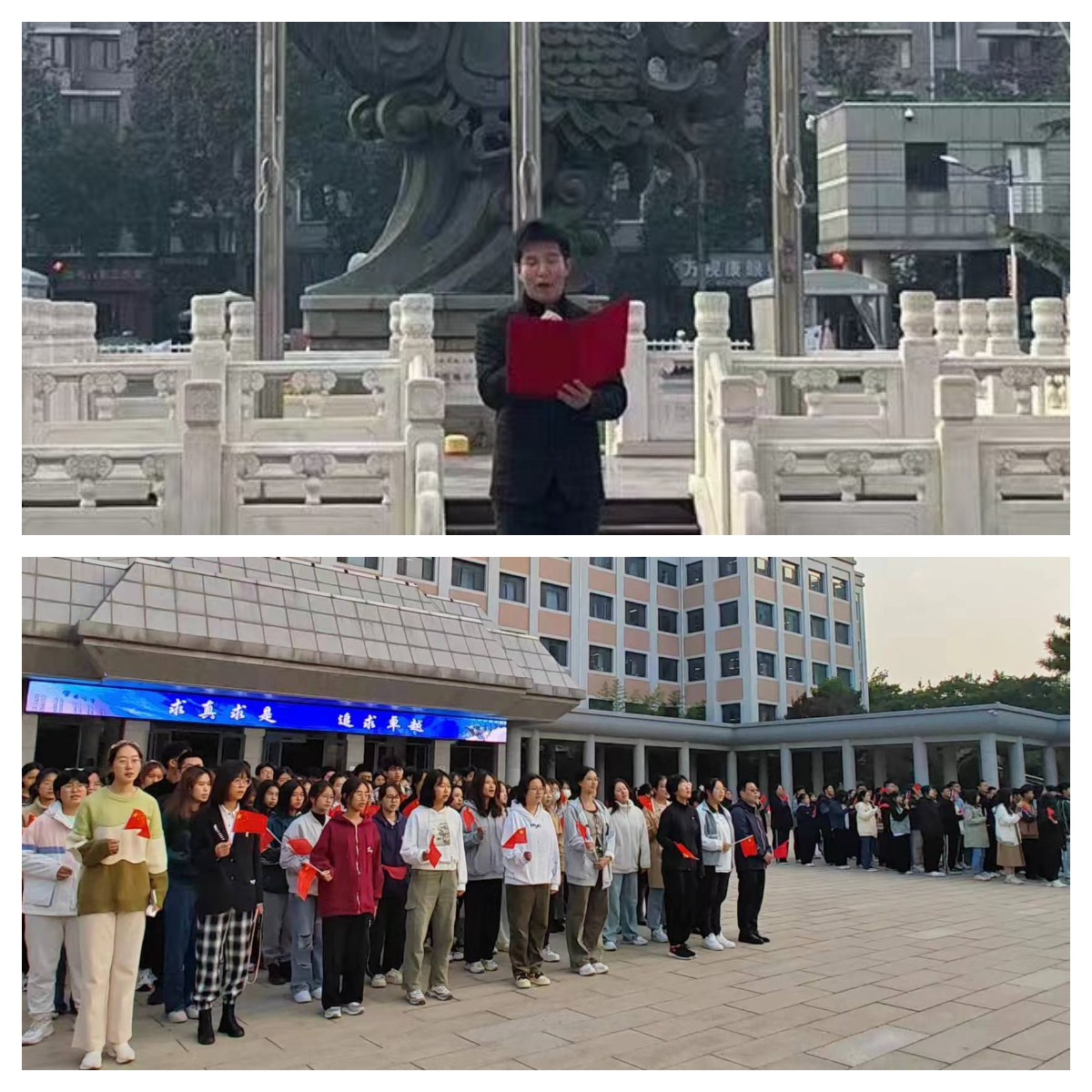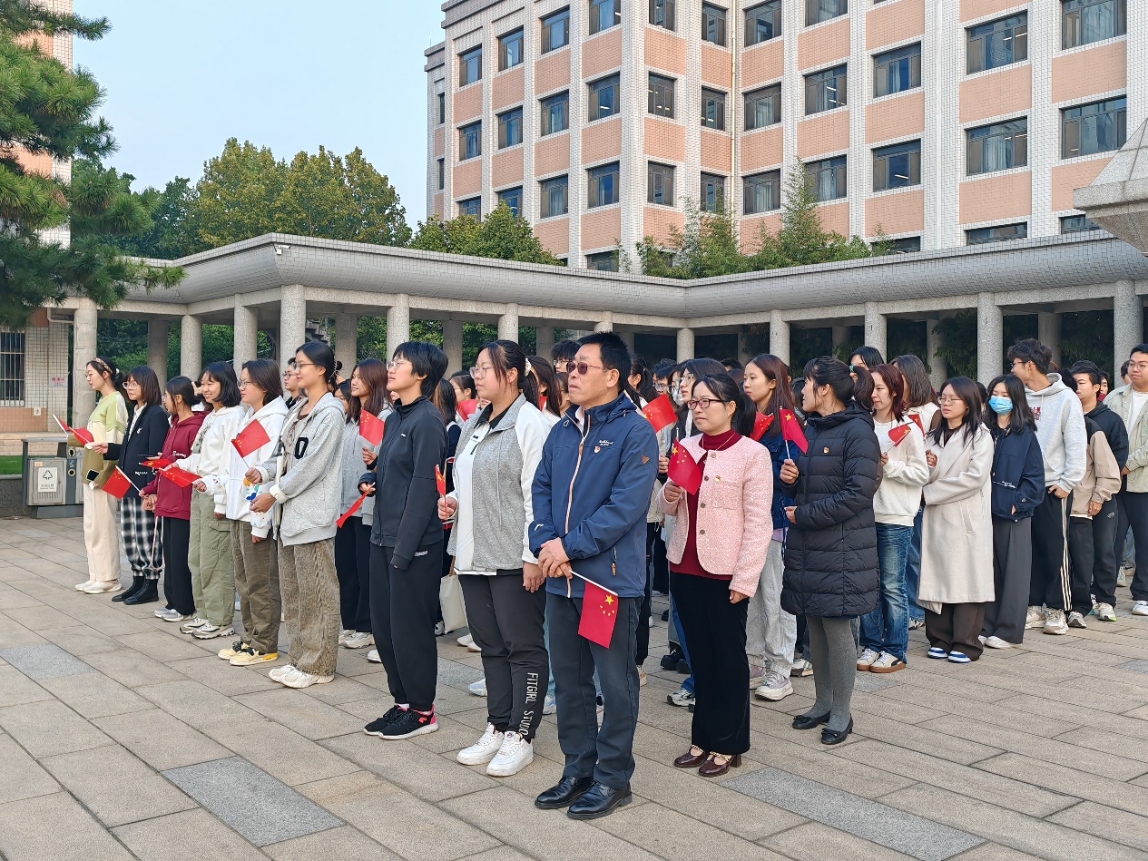 为深入学习贯彻习近平新时代中国特色社会主义思想和党的二十大精神,进一步加强2023级本科新生理想信念教育,2023年10月23日早上7点,beat365在线登录官网和社会与心理学院在主教楼南广场联合组织开展了“青春向党,强国有我,争做新时代好青年——国旗下的讲话”主题教育,活动内容包括观看升旗仪式和开展主题活动两个部分。beat365在线登录官网党委书记李跃新、党委副书记杨中英、辅导员龚莉云出席了本次活动,beat365在线登录官网135名本科新生和社会与心理学院全体新生参与了活动。