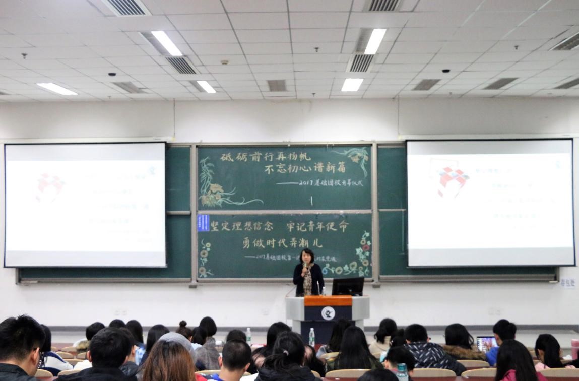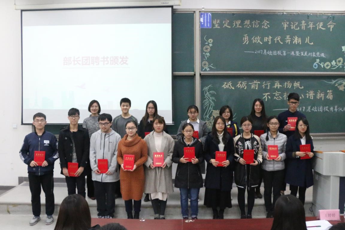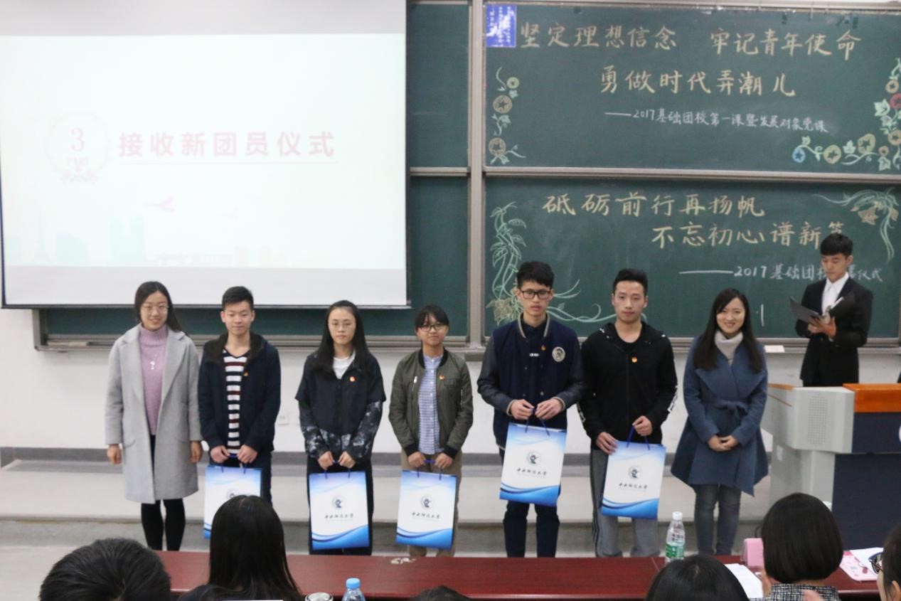 新生团员是此次基础团校培训的重点,2017年9月,beat365在线登录官网团委接收了246名新生团员,成立了7个新生团支部。为了加强新生团支部建设,举办了接收新生团员仪式。由优秀团员代表为新生团员代表佩戴团徽,研究生会主席马雅璇与17-1班芮+导师潘昊宁向新生团支部发放“薪火相传”团务工作资料包。