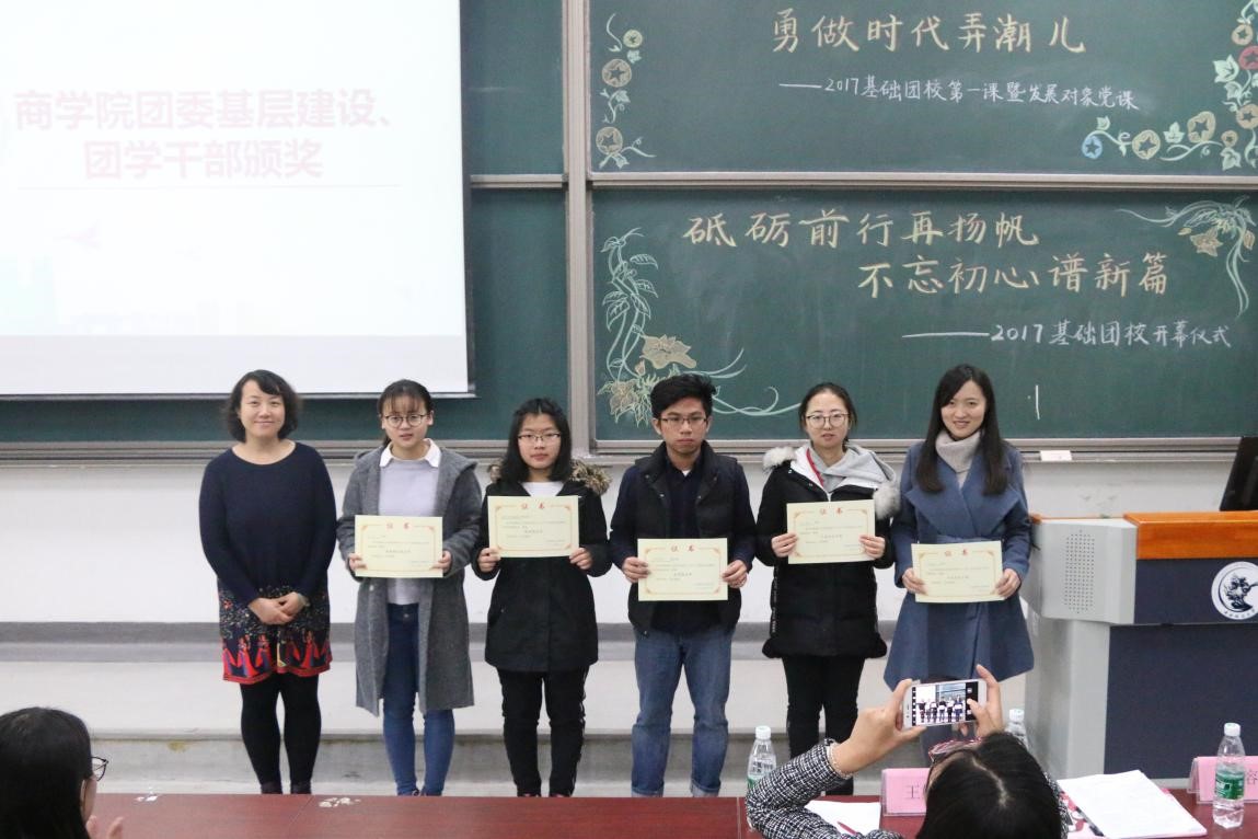 随后举行beat365在线登录官网团委学生会新一届主席团、部长团聘任仪式以及基层组织建设优秀单位和个人的表彰仪式。营销15等团支部荣获优秀团支部,营销16等团支部荣获优秀新生团支部,伙安婷等同学荣获beat365在线登录官网十佳学生干部称号。王容老师为获奖支部和同学颁奖。