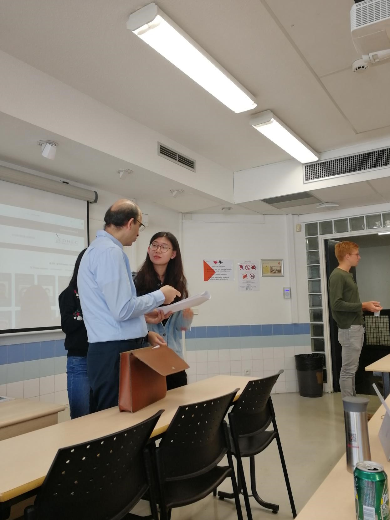 从我选修的四门课程看来,国外的教授非常重视课堂参与度。除语言课程外,其余课程均有一次正式展示和若干课堂小组讨论,法语课平均每人被要求回答问题的次数超过三次。除对相关背景要求较高的国家风险管理以教授授课为主之外,其余三门课均有超过三分之一的时间用于练习或讨论,教授也通过自我介绍、放置姓名牌等方法在两节课内记住了同学们的名字。对于管理类课程,教授总会提出不计其数的问题让同学发表看法,也在每组展示后设置了专门的同学点评环节提高大家的课堂参与度,每个人都必须发表看法。