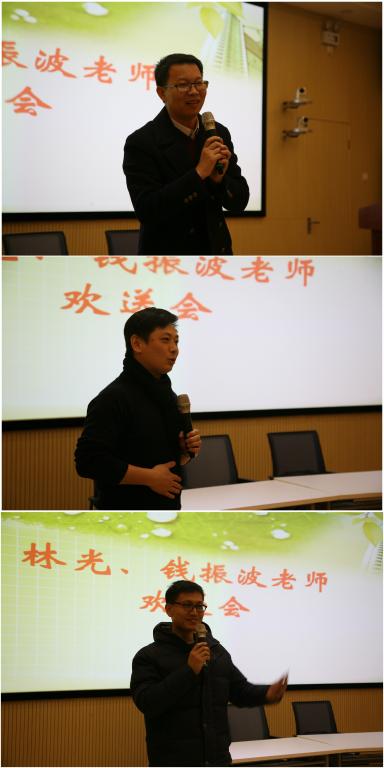 分工会首先为两位老师制作了欢送会PPT。PPT通过图片、视频回顾了两位老师在学院几十年的辛勤教学、桃李天下的丰硕成就,与学院同仁一起共事的点点滴滴,以及同事们的真诚祝福。林光老师、钱振波老师分别发言,感谢学院领导及同仁在工作中的支持和鼓励,感谢与同事们相处的快乐时光。王瑞华院长代表全院向两位学院元老级教工表示衷心感谢,感谢几十年如一日辛勤付出,为学院发展做出巨大的贡献,同时也希望两位老师继续关心关注学院发展,为学院发展发挥余热。葛建新书记委托林嵩副书记转达了对两位老师的祝福,并希望两位老师常回家看看。