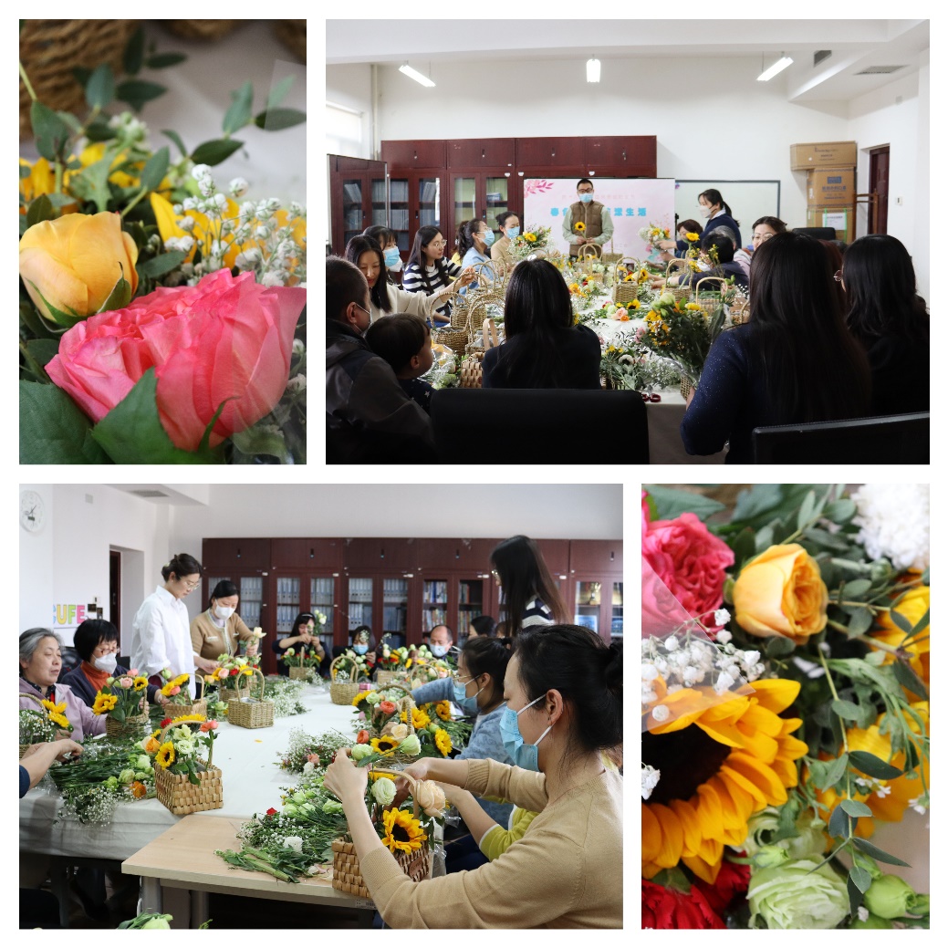 活动现场,花艺师向老师们讲解了花材、色彩搭配等方面的插花艺术造型技法知识。在轻松愉快的氛围中,从构思取材,到修枝搭配,一盆盆生机盎然的插花花篮作品展现在大家眼前。