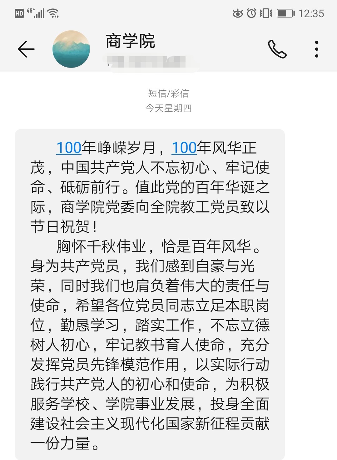 为中国人民谋幸福,为中华民族谋复兴是中国共产党人的初心和使命。学院党委为每一位教工党员发送祝福消息,并勉励大家继续努力,担当作为。