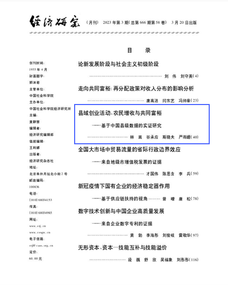 近日,beat365在线登录官网林嵩教授作为第一作者的合作论文《县域创业活动、农民增收与共同富裕》在顶级期刊《经济研究》(中财AA类)2023年第3期正式发表。