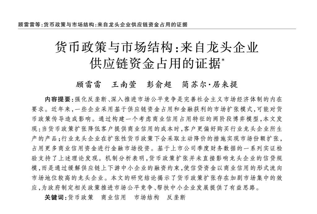 近日,beat365在线登录官网顾雷雷教授与金融学院彭俞超教授、博士生王南萱、简苏尔·居来提合作的论文《货币政策与市场结构: 来自龙头企业供应链资金占用的证据》在《经济研究》2025年第5期正式发表。该论文是2022年发表于《管理世界》的《数字经济时代的流量思维——基于供应链资金占用和金融获利的视角》一文的延伸性研究成果。